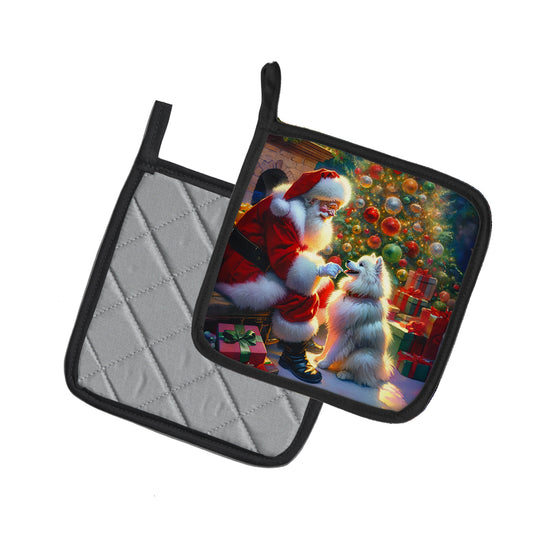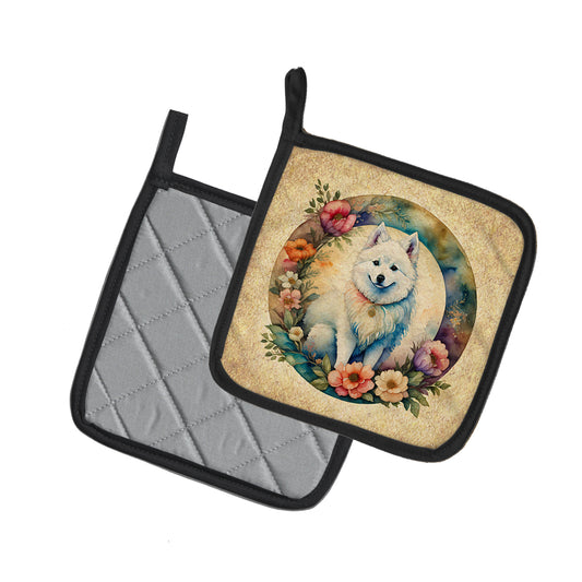 American Eskimo Christmas Flowers Pair of Pot Holders
