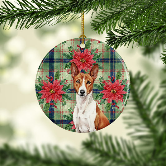 Red and White Basenji Christmas PoinsettIas Ceramic Ornament