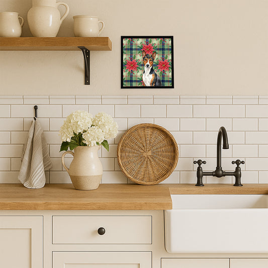 Tricolor and White Basenji Christmas PoinsettIas Framed Metal Print