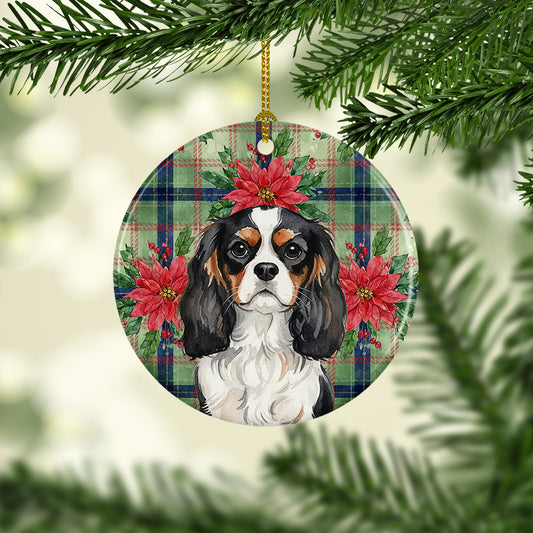 Tricolor Cavalier Spaniel Christmas PoinsettIas Ceramic Ornament