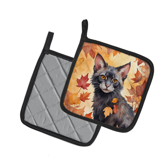 Lykoi Cat in Fall Leaves Pair of Pot Holders