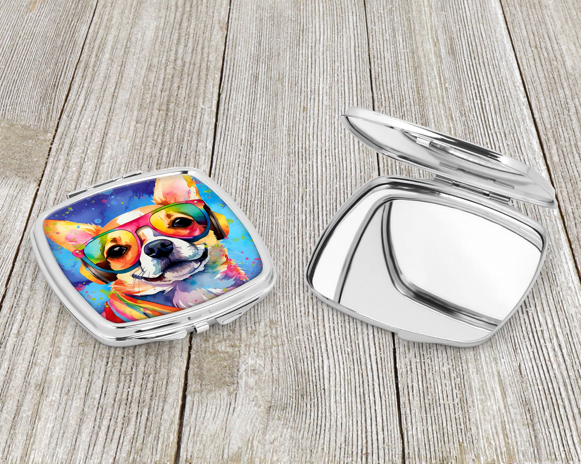 Compact Mirror featuring breed specific Chihuahua artwork. Introducing our Square Compact Mirror, a blend of elegance, functionality, and compactness, perfect for on-the-go touch-ups. This Silvertone metal mirror, with dimensions of 2.75 inches x 3 inches x .3 inches, fits effortlessly into your purse, handbag, or pocket, ensuring that you can check your appearance anytime, anywhere. Our compact mirror stands out with its eye-catching artwork on the front, adding a dash of style to this practical accessory. It is more than just a mirror; it's a statement piece that reflects your personality and aesthetic. When opened, this compact reveals two mirrors inside, doubling your perspective for precise touch-ups. The Silvertone metal construction ensures durability while maintaining a lightweight feel, making it an ideal everyday carry item. Whether you're rushing to a meeting, prepping for a dinner date, or just need a quick check on your look, our Square Compact Mirror is your reliable companion. Experience the perfect blend of style and practicality with this must-have accessory.