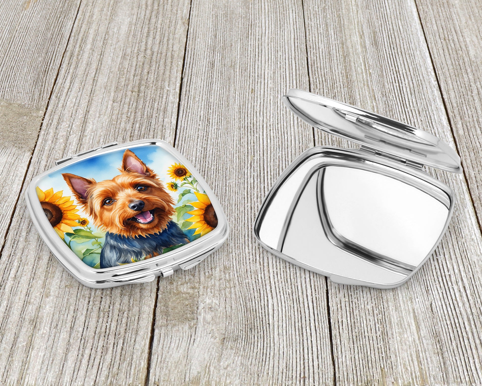 Compact Mirror featuring breed specific Australian Terrier artwork. Introducing our Square Compact Mirror, a blend of elegance, functionality, and compactness, perfect for on-the-go touch-ups. This Silvertone metal mirror, with dimensions of 2.75 inches x 3 inches x .3 inches, fits effortlessly into your purse, handbag, or pocket, ensuring that you can check your appearance anytime, anywhere. Our compact mirror stands out with its eye-catching artwork on the front, adding a dash of style to this practical accessory. It is more than just a mirror; it's a statement piece that reflects your personality and aesthetic. When opened, this compact reveals two mirrors inside, doubling your perspective for precise touch-ups. The Silvertone metal construction ensures durability while maintaining a lightweight feel, making it an ideal everyday carry item. Whether you're rushing to a meeting, prepping for a dinner date, or just need a quick check on your look, our Square Compact Mirror is your reliable companion. Experience the perfect blend of style and practicality with this must-have accessory.