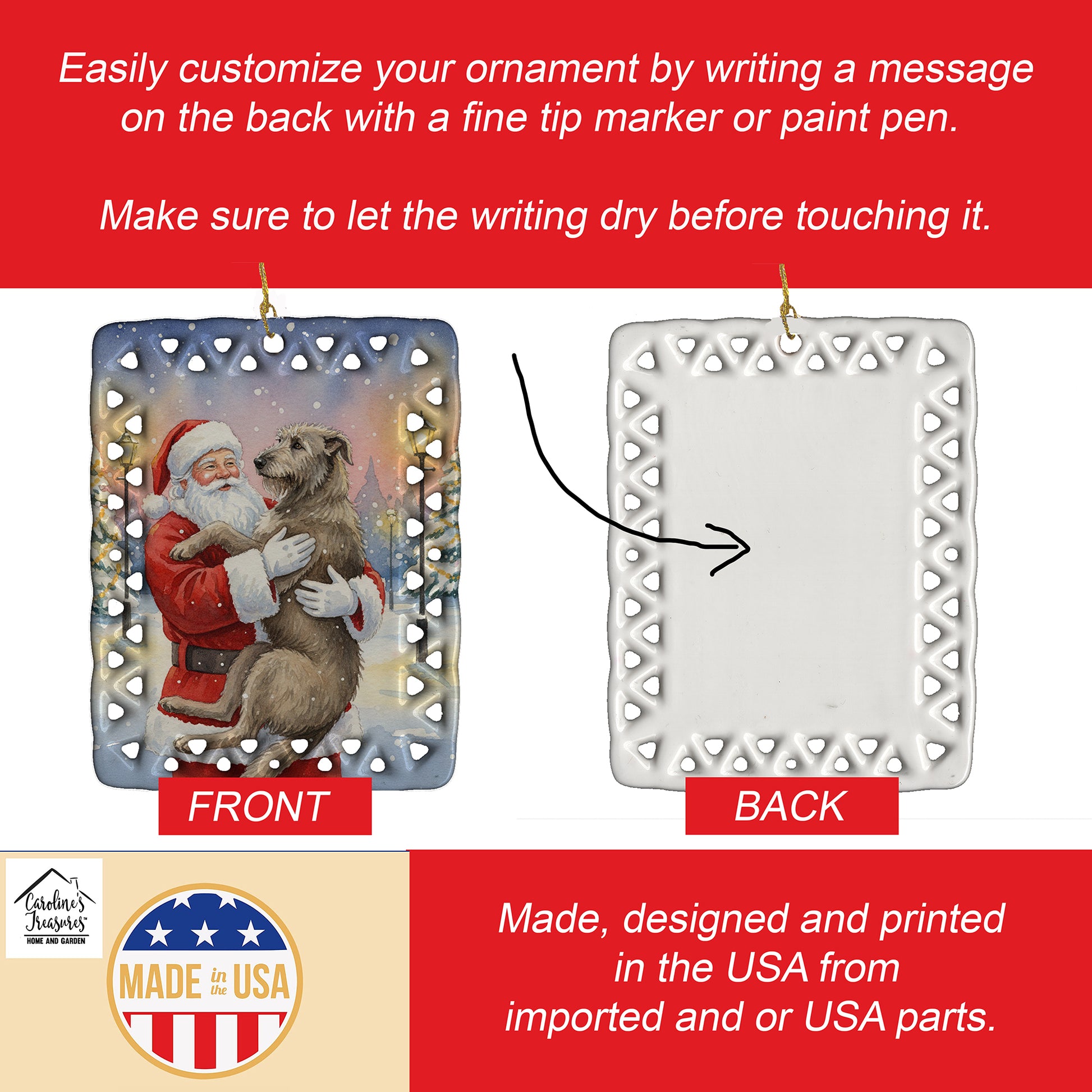 Porcelain Ornament featuring breed specific Irish Wolfhound artwork. Celebrate Christmas with this Christmas Ornament. Add a unique, personal touch to your holiday decor with our Rectangular Lattice Porcelain Ornament. Perfect for creating cherished memories, this high-quality ornament shines under festive lights, reflecting warmth and joy throughout your Christmas tree. Crafted with a glossy finish, it showcases vibrant, full-color artwork contributed by our talented artists, ensuring your tree is adorned with a burst of color and holiday spirit. What sets this Porcelain Ornament apart is its customizable white back. Use a paint pen or permanent marker to write a heartfelt message, commemorate a special year, or mark an unforgettable date, turning this ornament into a keepsake that will be treasured for years to come. For best results, allow any personalization to dry thoroughly before handling. Each ornament comes complete with a delicate gold cord, making it easy to hang and display. Proudly made in the USA, this ornament measures 3.375 x 2.625 inches and is a thoughtful gift for pet sitters, teachers, family members, or anyone who would appreciate a little extra holiday magic. Bring style, charm, and a touch of personal meaning to your Christmas tree with this beautifully designed ornament..